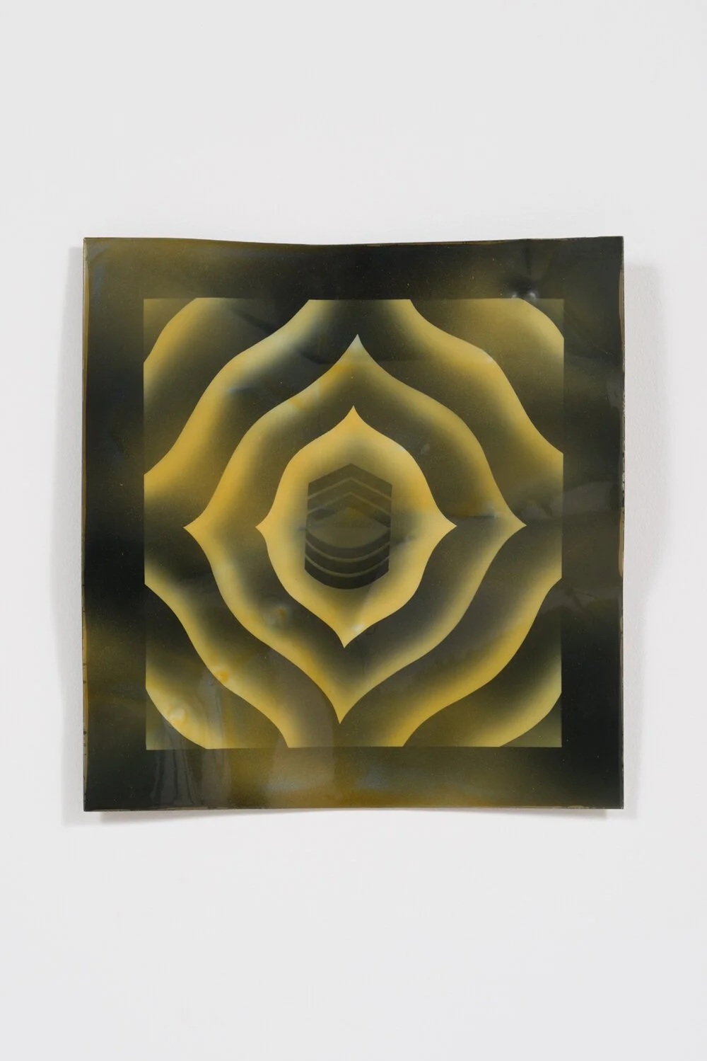 With the added variables of chatoyant spray lacquers and polyurethane on manipulated aluminum sheets, Bengston liberated the dimensional vocabulary of painting when he initiated the “Dentos” in 1965. As Bengston asserts, "if viewed correctly you lose the edges - the painting goes forward, the painting goes back, the painting is in flux. It was everything that I think that we had to think of as Modernists at that time." The period in which this work was produced, not coincidentally, correlated with Bengston's other professional career: motorcycle racing. As a part of his West Coast counterculture attitude, Bengston’s obsession with motorcycle and car culture led him to this new way of painting.