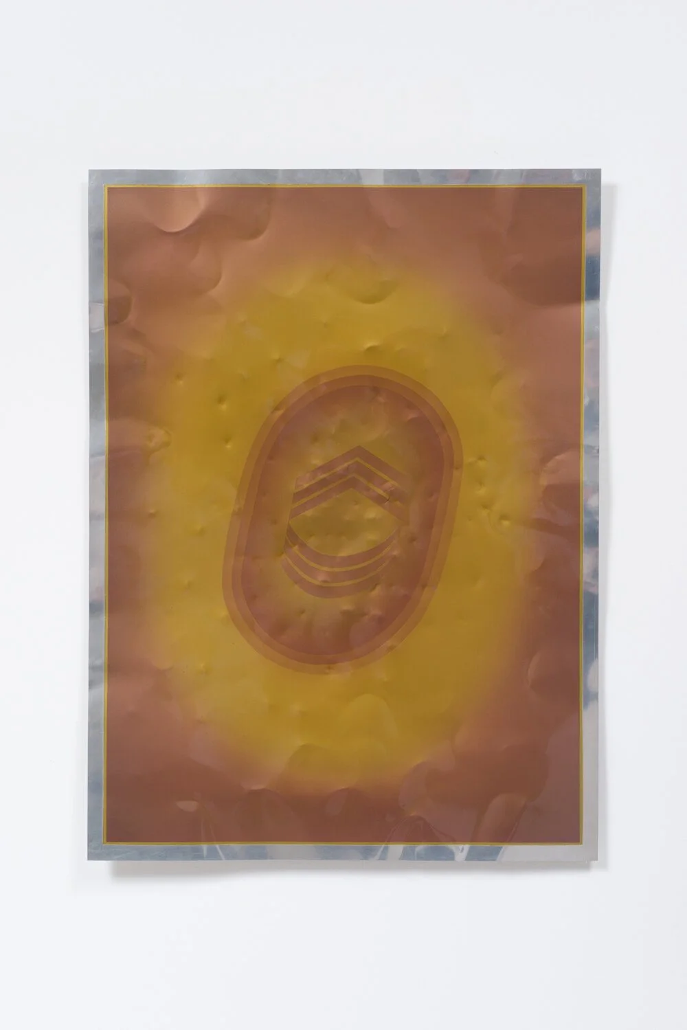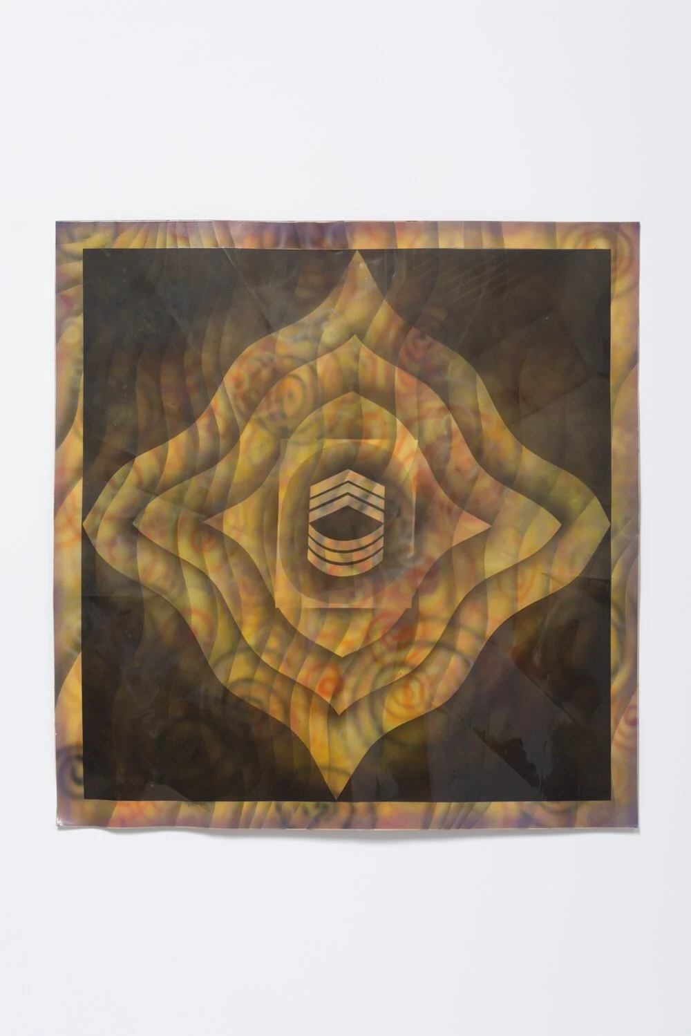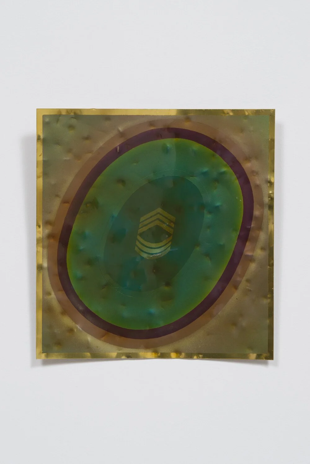 It was in the late 1950s that Bengston originated his trademark inclusion of single, centralized icons in his work, primarily referencing three appropriated images: “Chevrons” (sergeant stripes haloed within an orb within a rectangle), “Draculas” (flowers illustrated on Iris brand sugar packets), and hearts (of the Valentine’s Day variety). In the early 1960s, working with high gloss oil on Masonite, Bengston combined these emblems with color field abstractions, first showing his bold “Chevron” paintings at the Martha Jackson Gallery in New York in 1962.