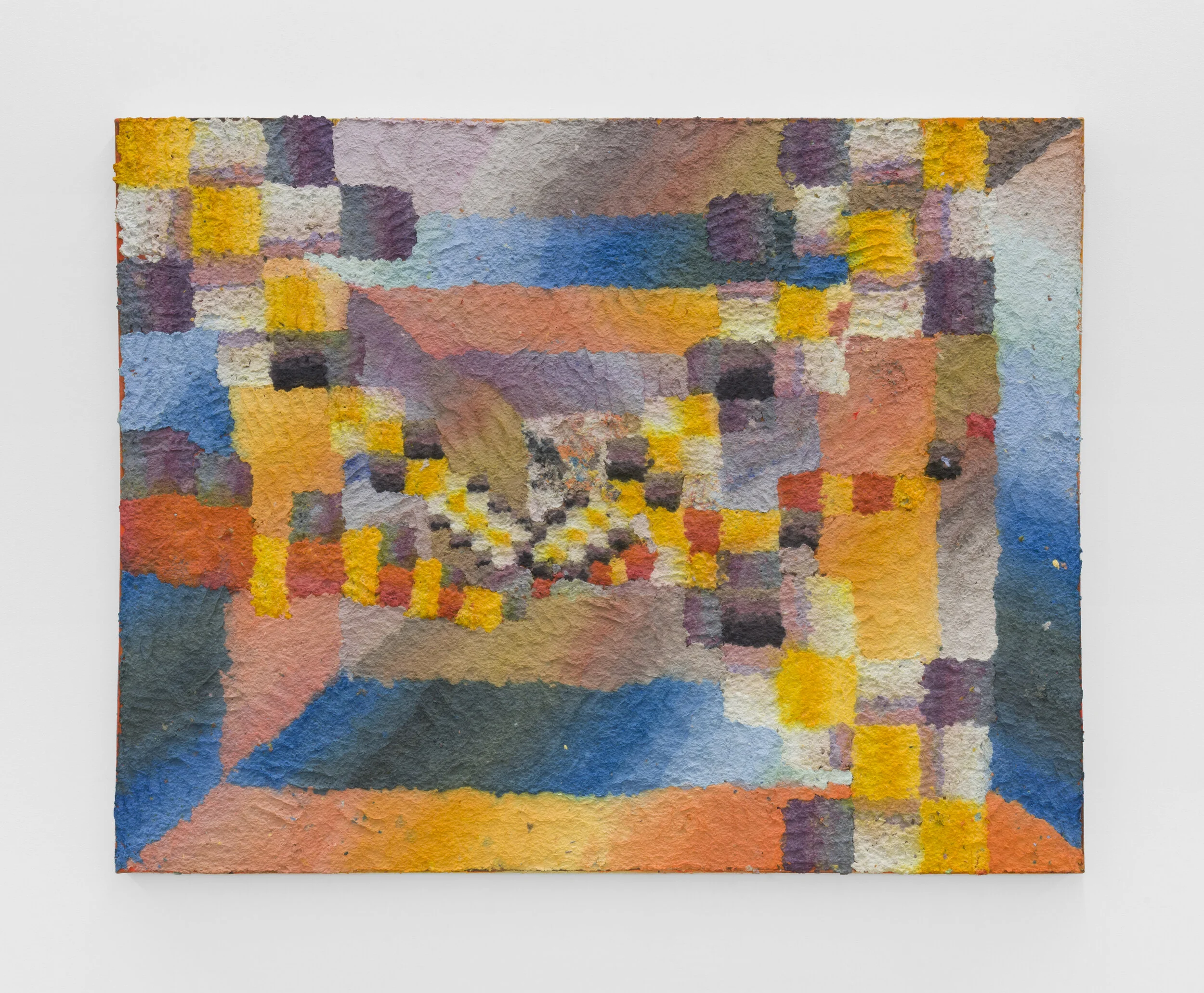 Soucek’s patterns are inspired by the history of utilitarian textiles and elements that mirror the exterior world. Each intense color harmoniously fades or bleeds into the next, creating a landscape in the artist’s all-encompassing vision. Soucek’s palette reflects an extensive study of Howardena Pindell, Sam Gilliam, and Milton Avery, as well as fragments of natural encounters. As she works the paper pulp to compose visual moments, inch by inch, Soucek derives a kinship with Pindell’s paper chad assemblages; in each, multitudes of solid elements are manually combined resulting in a detailed, texturally rich surface that maps energy, emotion, and instinct. Compositions encompass more than bold colors: depth appears as pleats overlap with pigments, resulting in new hues at each intersection. These abstract works have a sculptural quality, as the molded medium forms a relief, extending from the picture plane. Color and shape unfold appearing in spectral washes, creating patterned images that are both emotional and relatable.